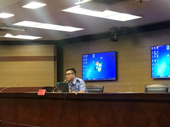 最后一站,便到了绍兴市公安局。同学们站在门前,感觉空气似乎也多了几分庄重肃穆。在明亮宽敞的报告厅中,李晓雯警官为大家介绍了绍兴市概况、公安的警种、公安内部架构、犯罪案件侦破率等,显示出公安系统的严密和复杂,以及公安队伍保卫社会的力量和决心。随后,刘宇警官为大家介绍了市反欺诈运营情况,以及对大学生网络反欺诈的关注,为同学们传授了许多经验和知识。最后,同学们市公安局餐厅用完午餐,便结束了一天的行程。