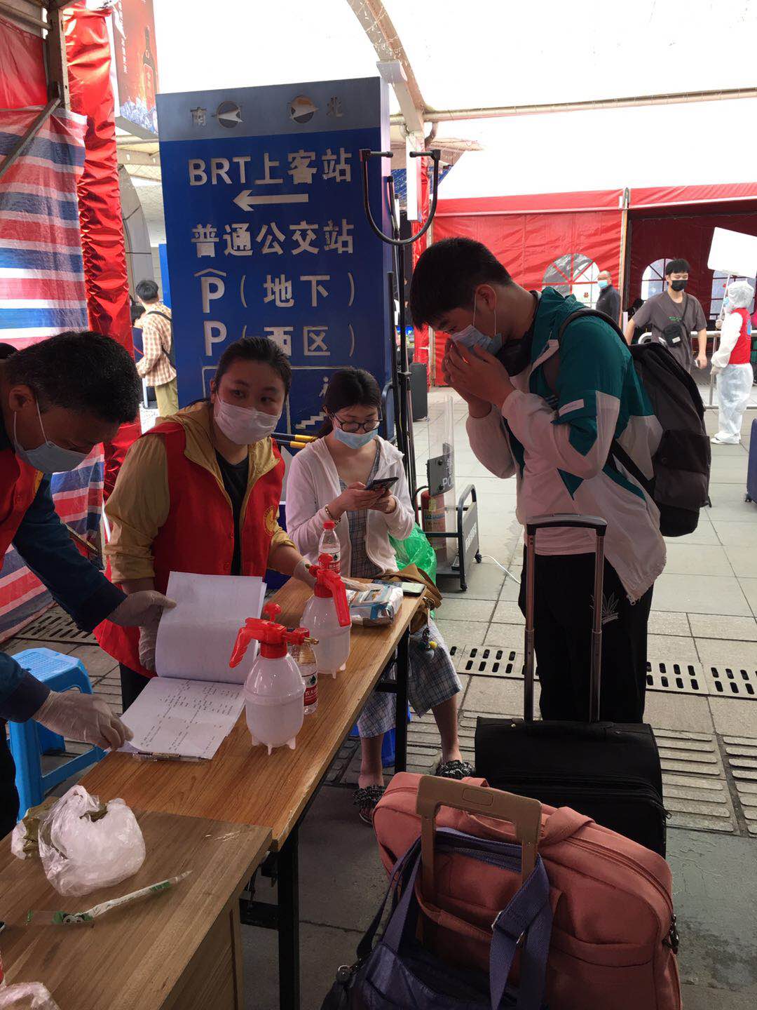 “你好,请问是*同学吗,我是负责接站的老师,你出站了吗?不要急慢慢来哦,我们在出站口等你。”“同学,欢迎回家,先来这边测体温,消毒哦。”专设报道点,专车接送、发放爱心口罩,这是学院为返校学子准备的第一份温暖。