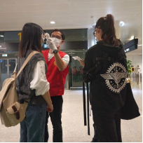 (00:25的萧山机场,教工志愿者为到达学生测温)
