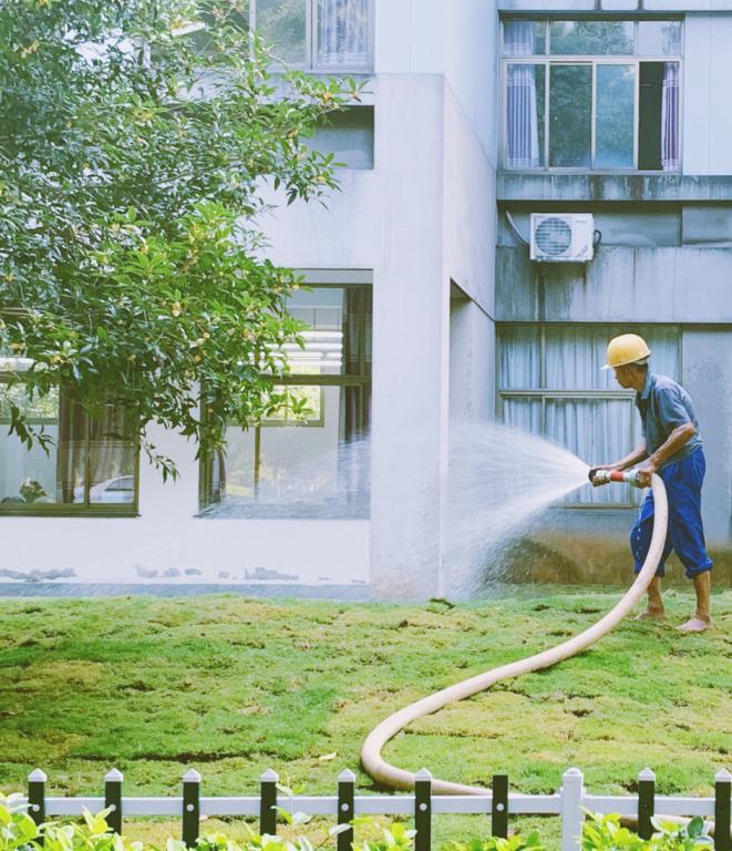 大叔正细心浇灌校园的花菜树木