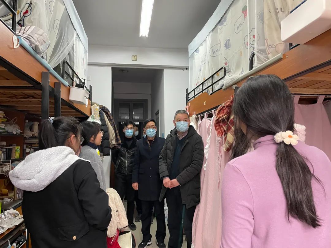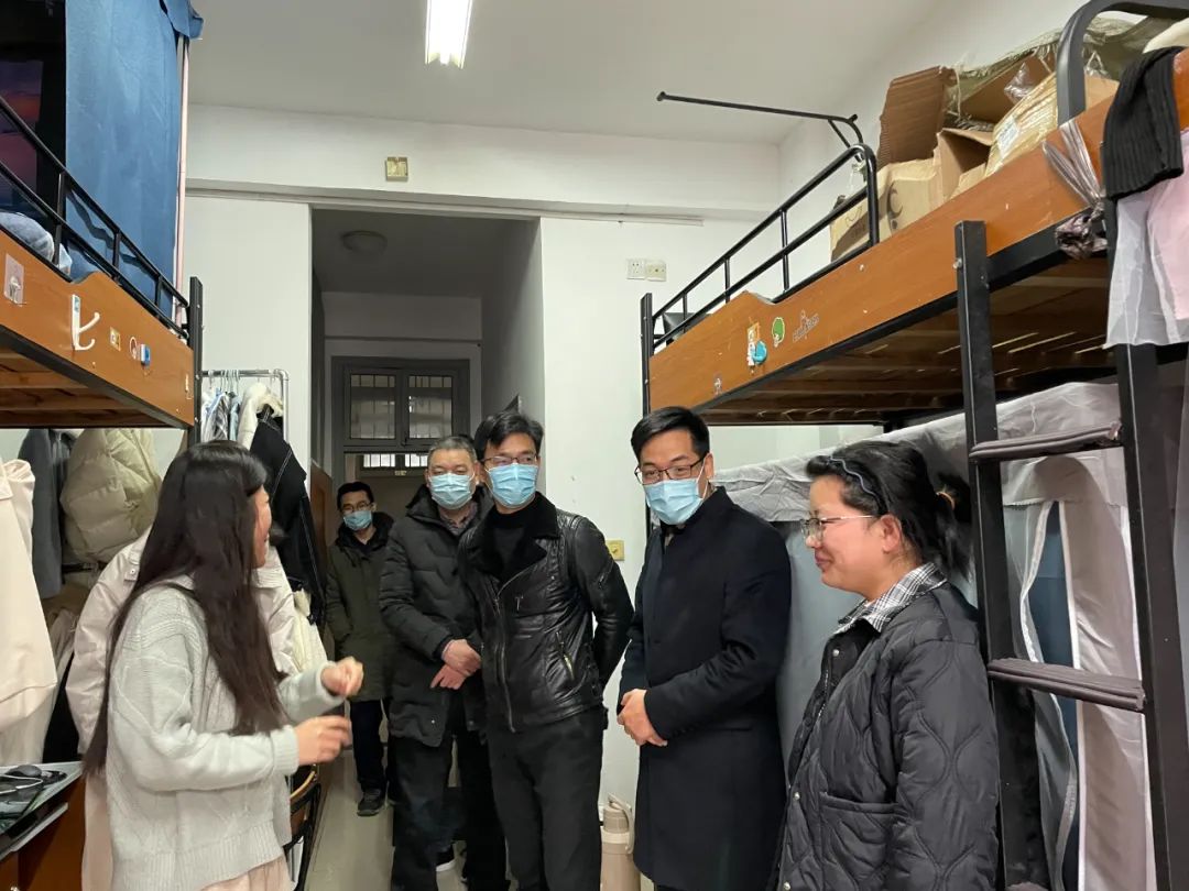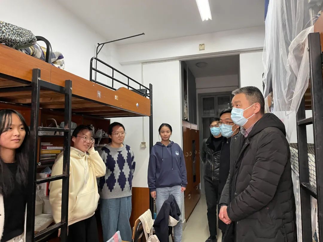 12月16日中午,院长周鸿勇、院党委副书记史正东、副院长丁志刚、学工副书记周建强、学生科科长赵宝山一行走进文澜看望商院学子,了解在疫情防控时期,同学们的网课学习以及生活状况。