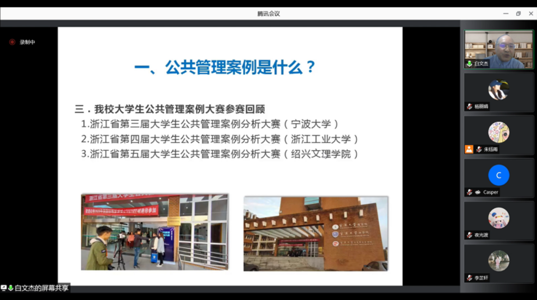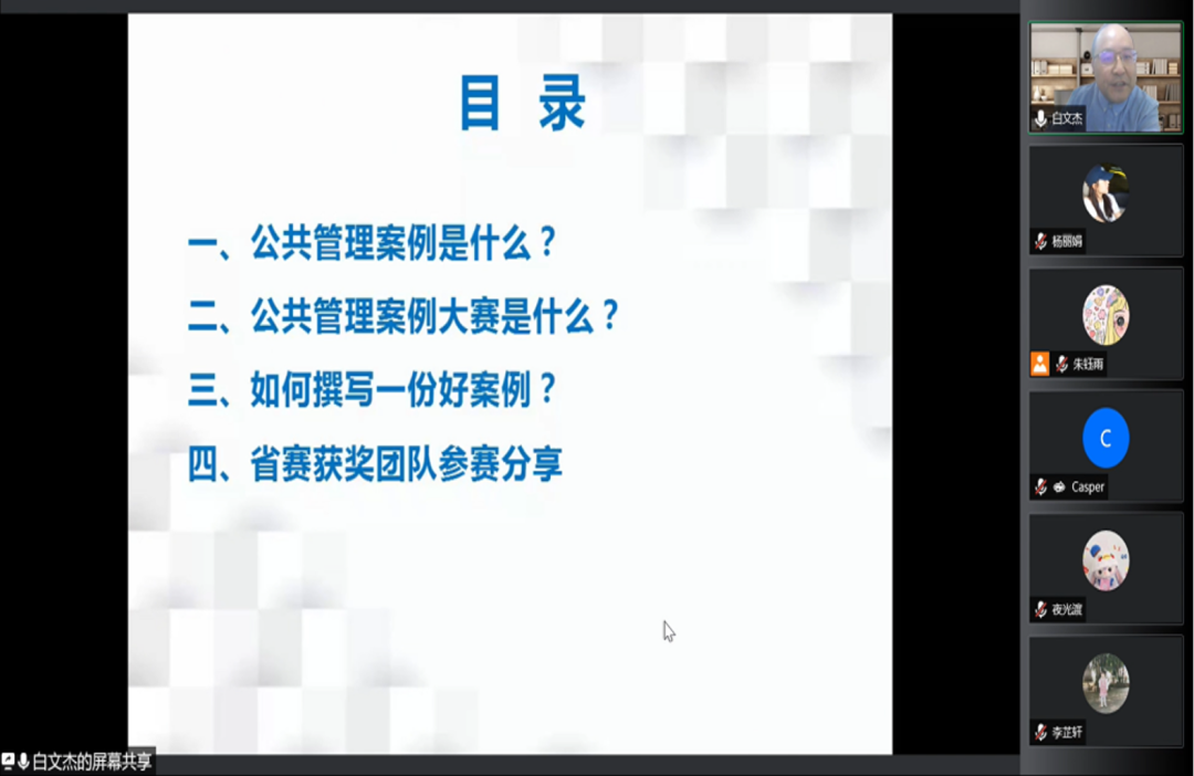 指导分享会通过腾讯会议线上直播的方式举行,分享会邀请到了公共管理系系主任白文杰老师以及往届获省一、二等奖的队伍负责人——惠泽伟学长和赵雨晴学姐。
