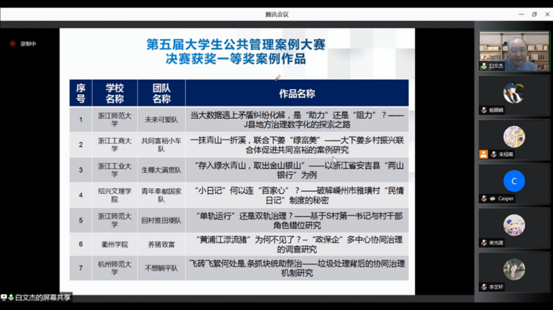 白文杰老师围绕大赛主题,结合“数字化改革、高质量发展、后脱贫时代”等浙江“十四五”经济社会发展的新动向和“浙江高质量发展建设共同富裕示范区”的最新实践,并根据自身带队经验对本次公共管理案例大赛进行专业指导。