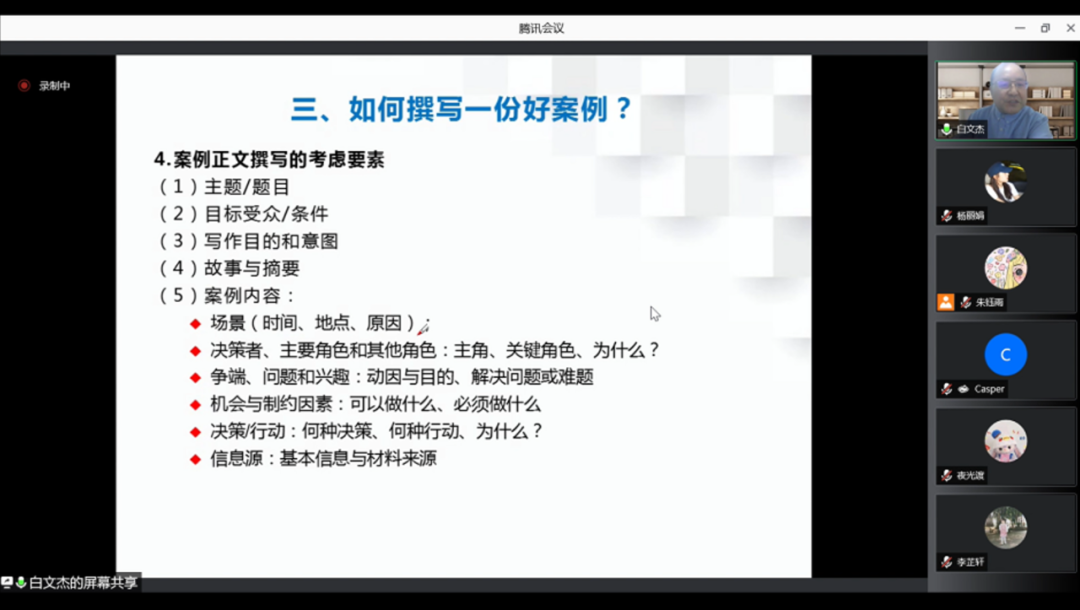 惠泽伟学长认为参赛首先需要做好思想准备,充分衡量自己的时间和精力。其次是完成组队,寻找适合的团队负责人、组员和指导老师。他指出,找好案例是成功的开始,好案例其实就在我们身边。确定选题后,进行文献研究、开展调研也是重要的环节。对于文本撰写。惠泽伟学长结合自身经历,总结案例分析撰写的关键要素,并提醒大家需要多多注意参考文献的规范性。